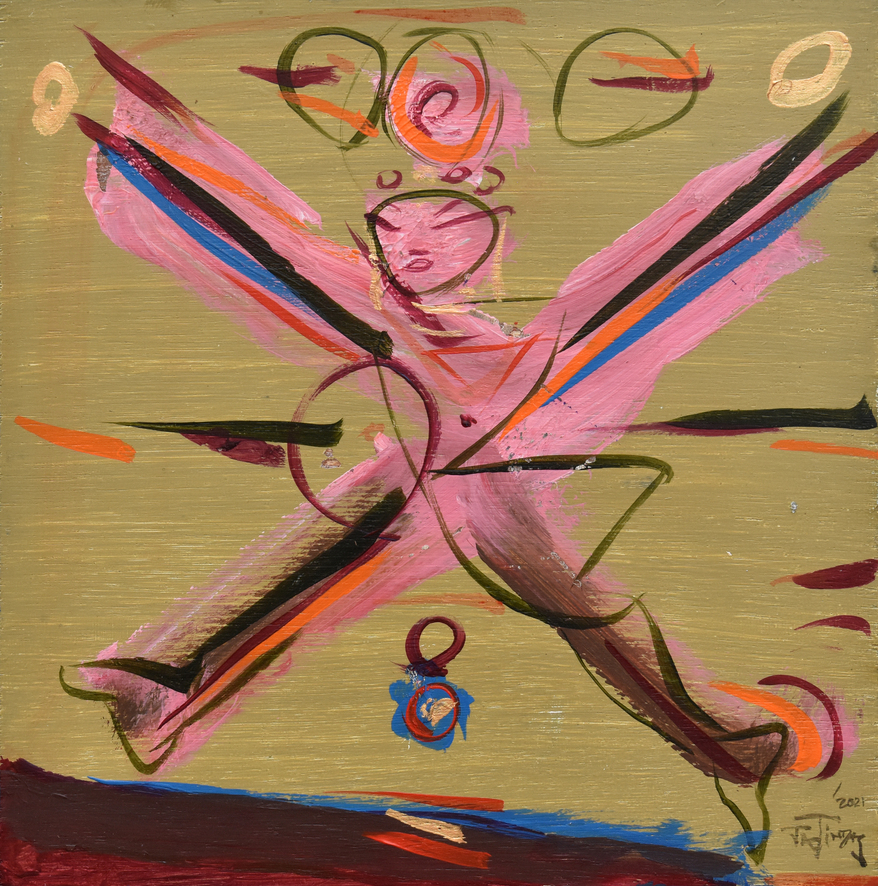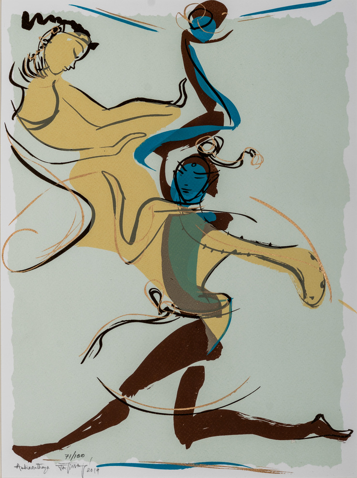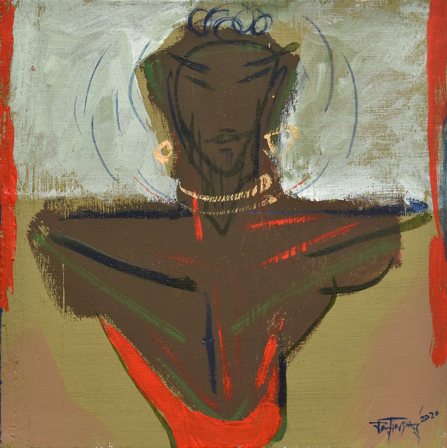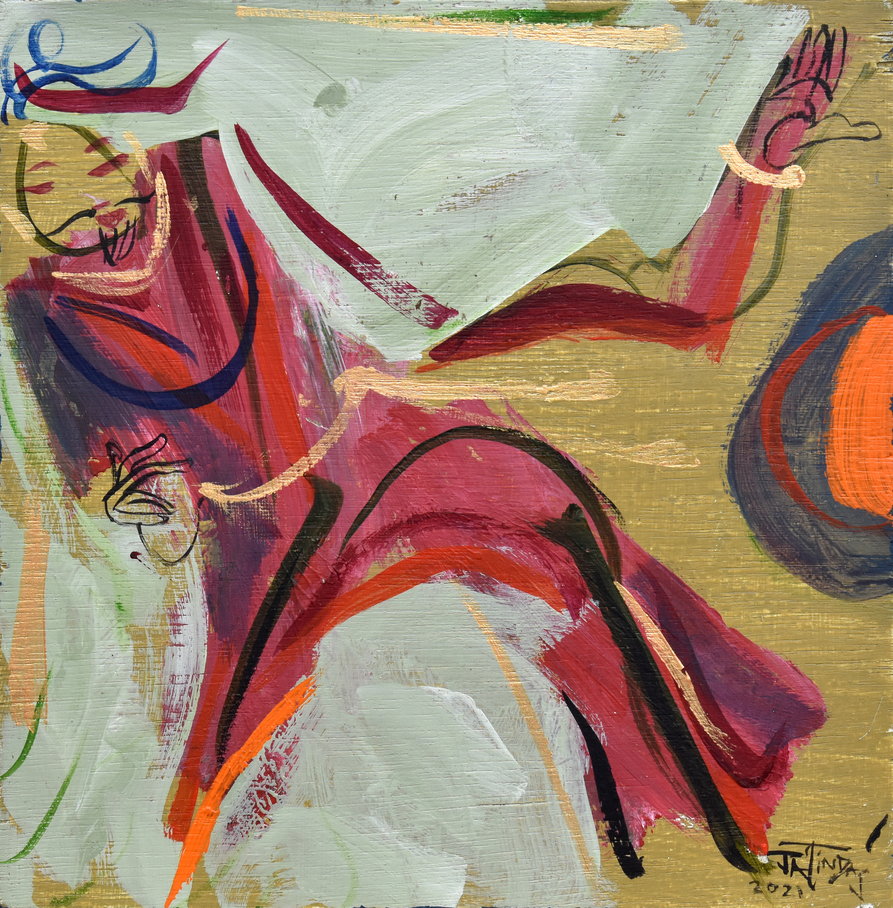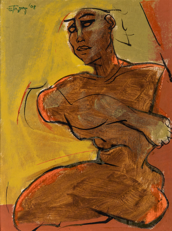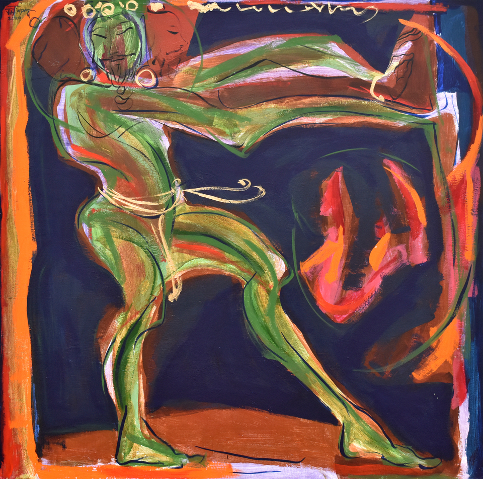 Das’s oeuvre primarily revolves around the human body’s movement and energy, capturing intricate relationships, emotions, and thoughts with minimal strokes and vibrant colours. In his conversation with Tarana Khubchandani, Jatin says, “I don’t paint my canvases, I sculpt them,” evident in his large canvases with a distinctive colour palette.