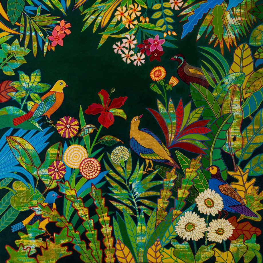 Over the years, her artistic evolution encompasses themes such as gender relationship, primarily focusing on the female form concentrating on the precision of the male form. Kshatriya, soon shifted focus and delved into nature, exploring the forms and hues of the flora and fauna. Her artwork emits mysterious curiosities depicting a combination of multiple art forms to pursue beauty in colour and design using various fine art techniques like analogue collage like patchwork, marbling, and painting, she introduced modern materials, such as acetate sheets, creating a new visual language that juxtaposes beauty with time.
