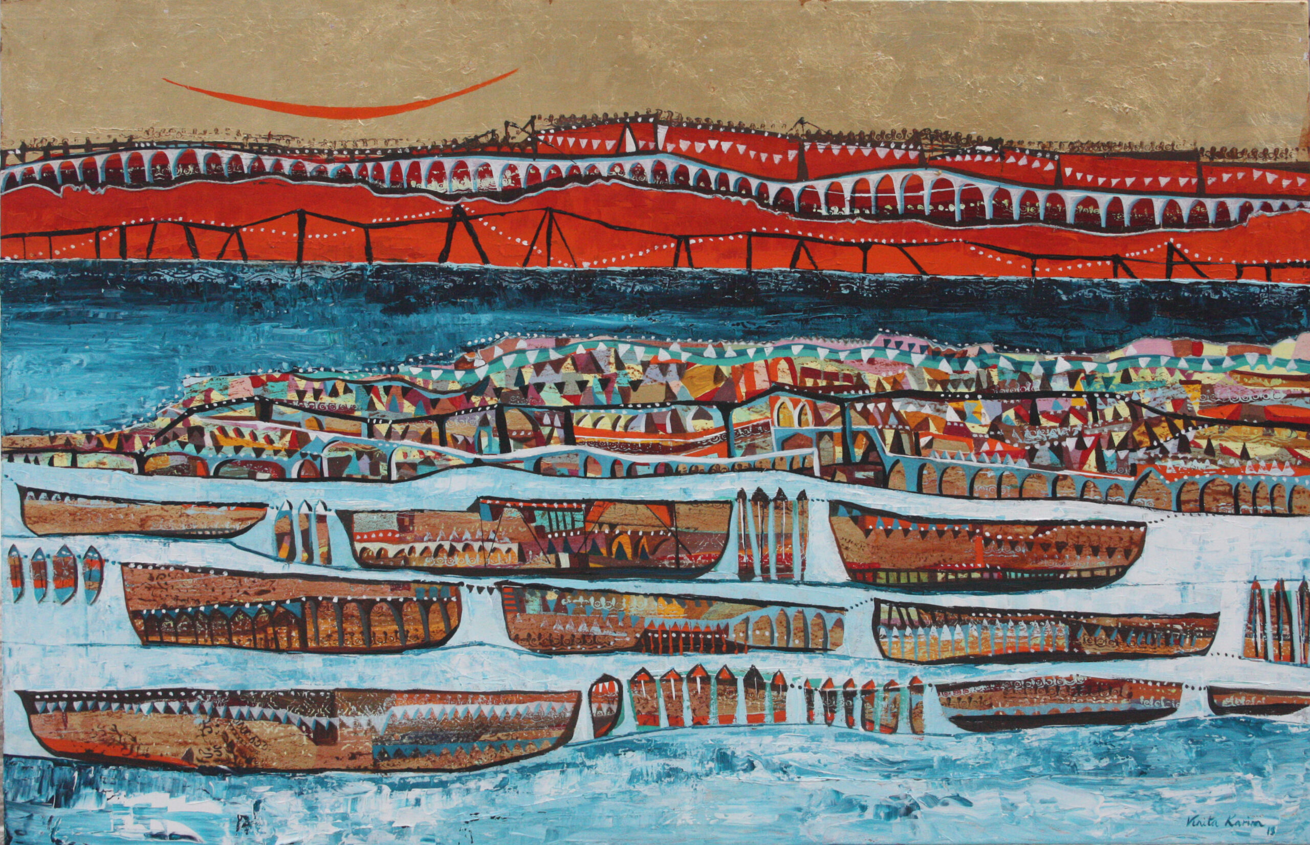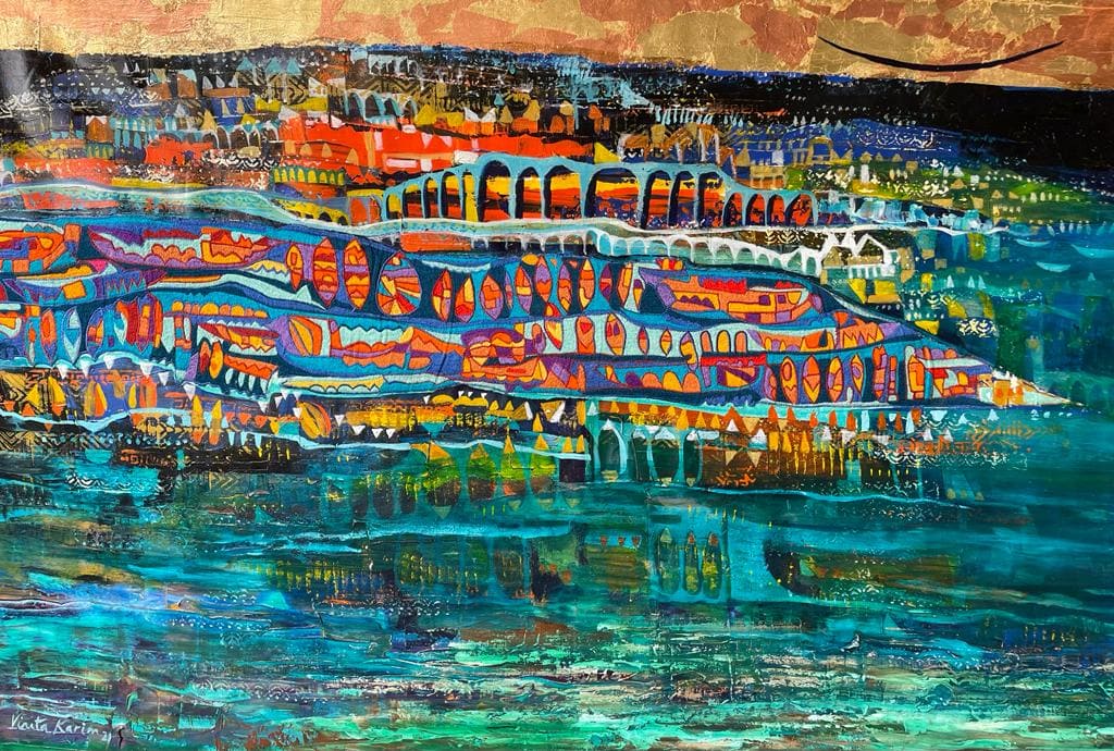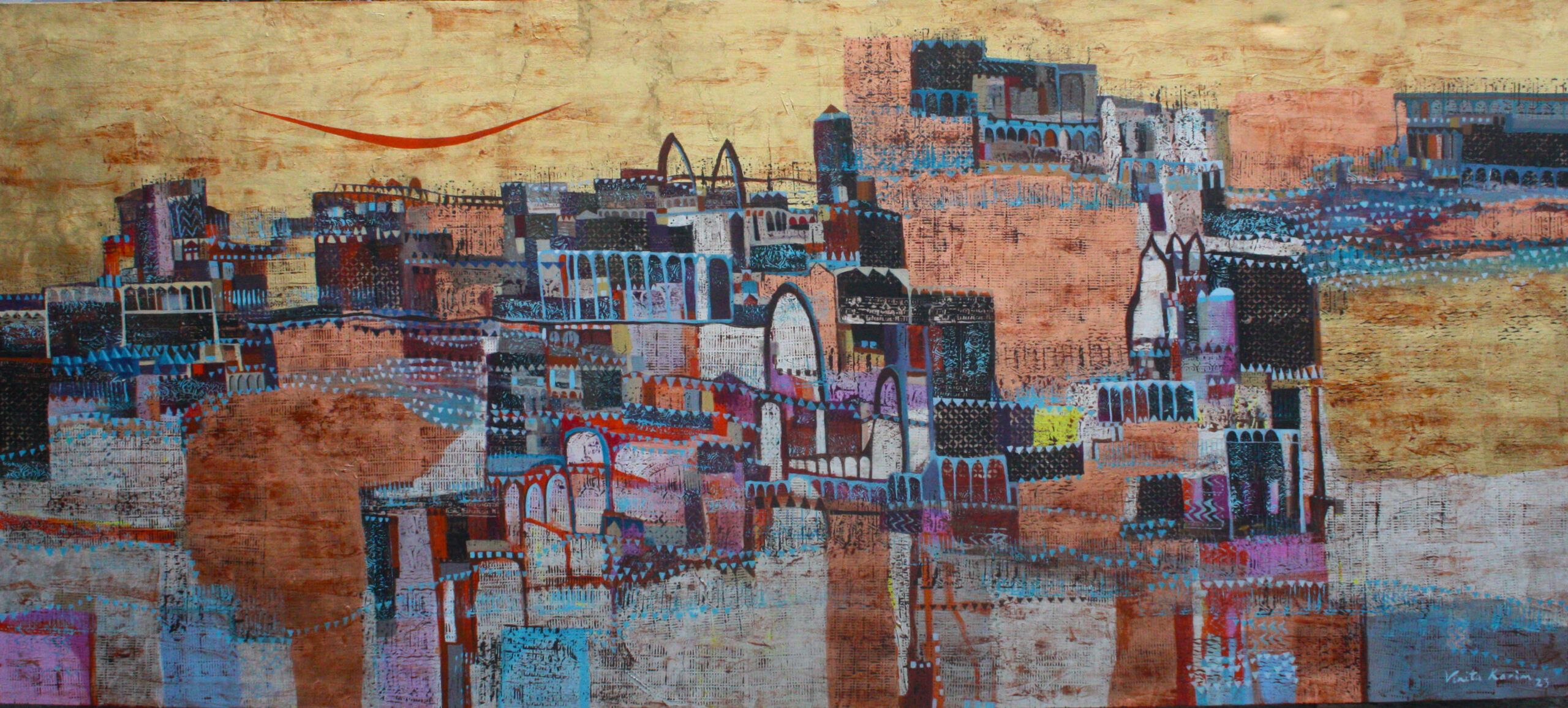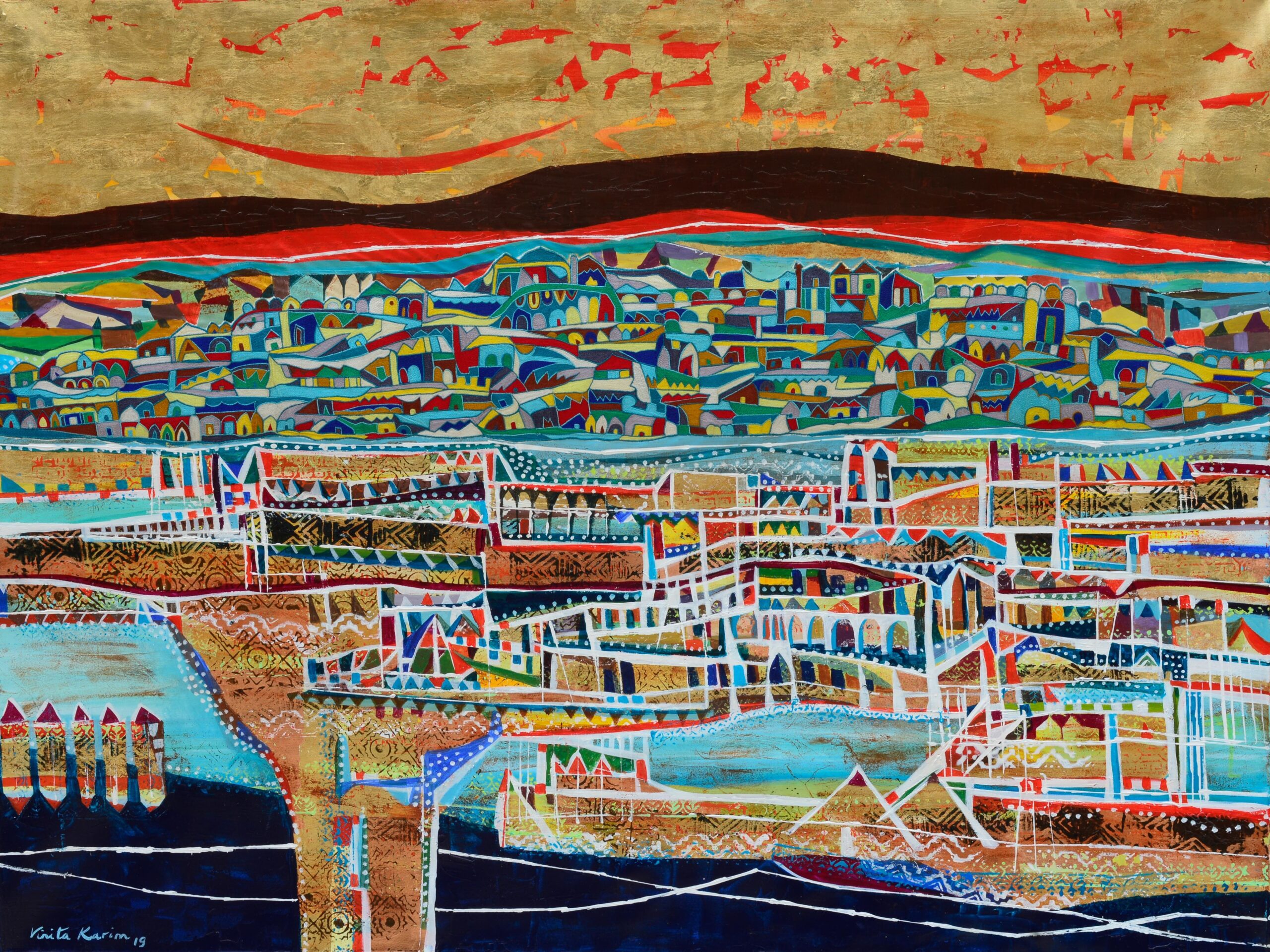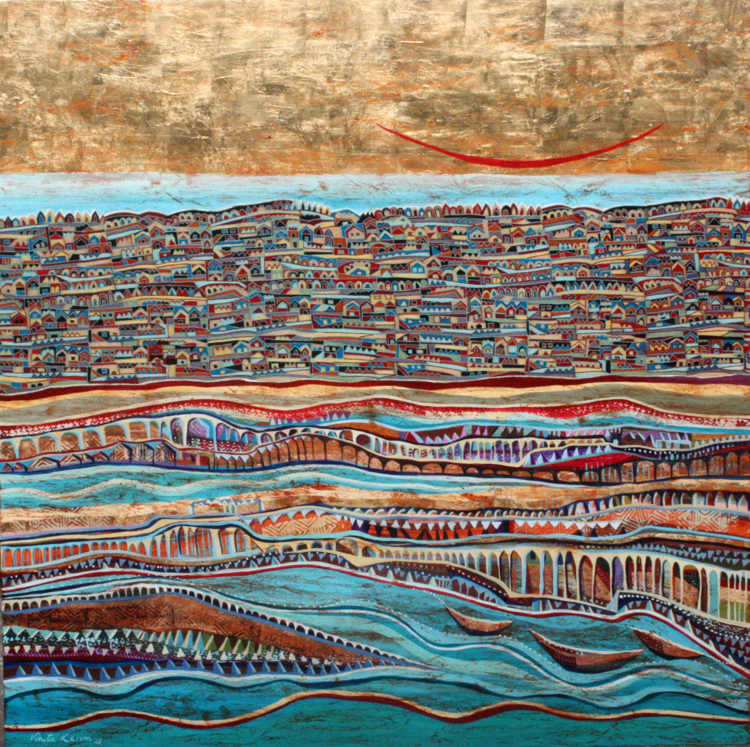 Her nomadic lifestyle is evident in her paintings as she celebrates this diversity from a deep respect and appreciation of divergent cultures which meld together in our interconnected world. The Moghul miniatures, Arabic calligraphy, intricate embroideries from Bangladesh, use of gold-leaf from Egypt, combined with an art background from Sweden and the Philippines are few of the factors which depict her deep love to the rich traditions of craftsmanship via her complex, vibrant canvases.