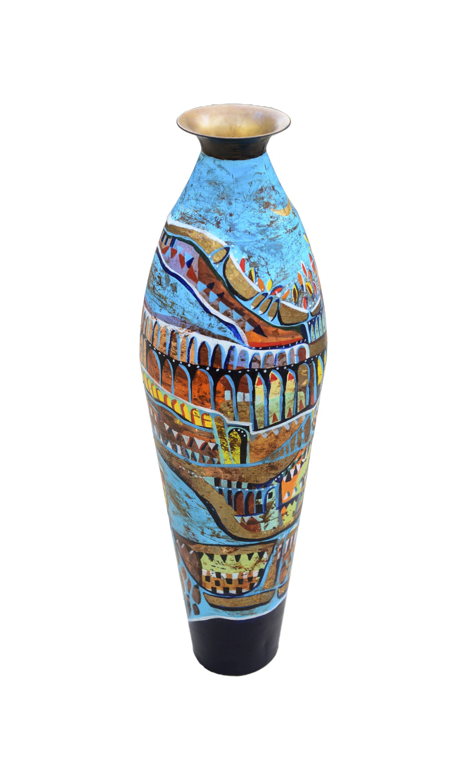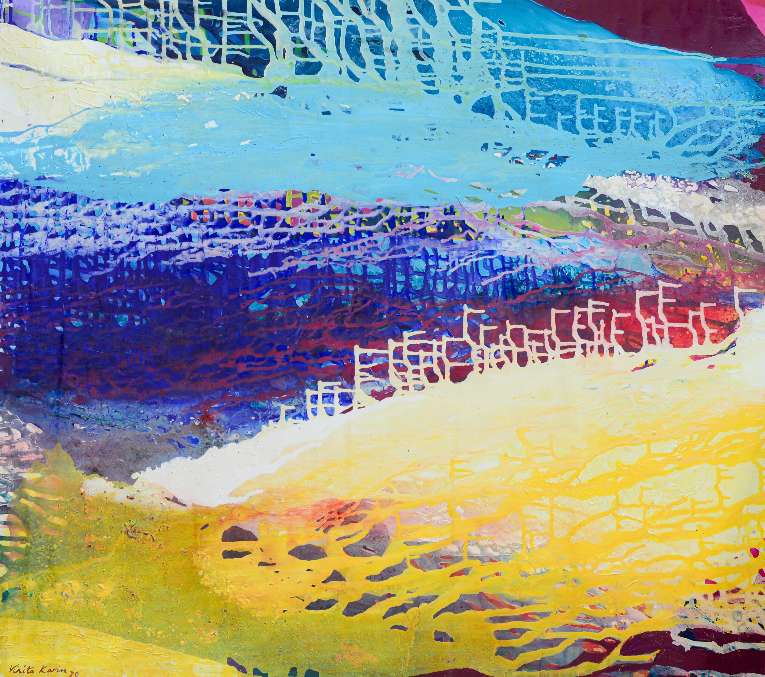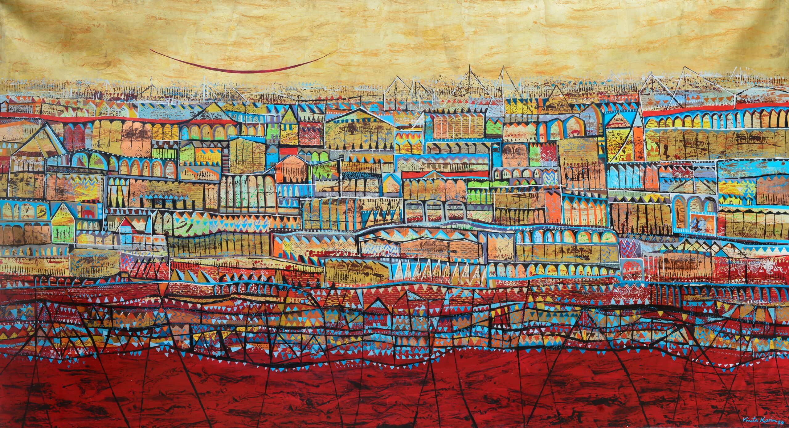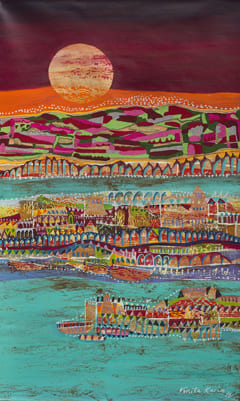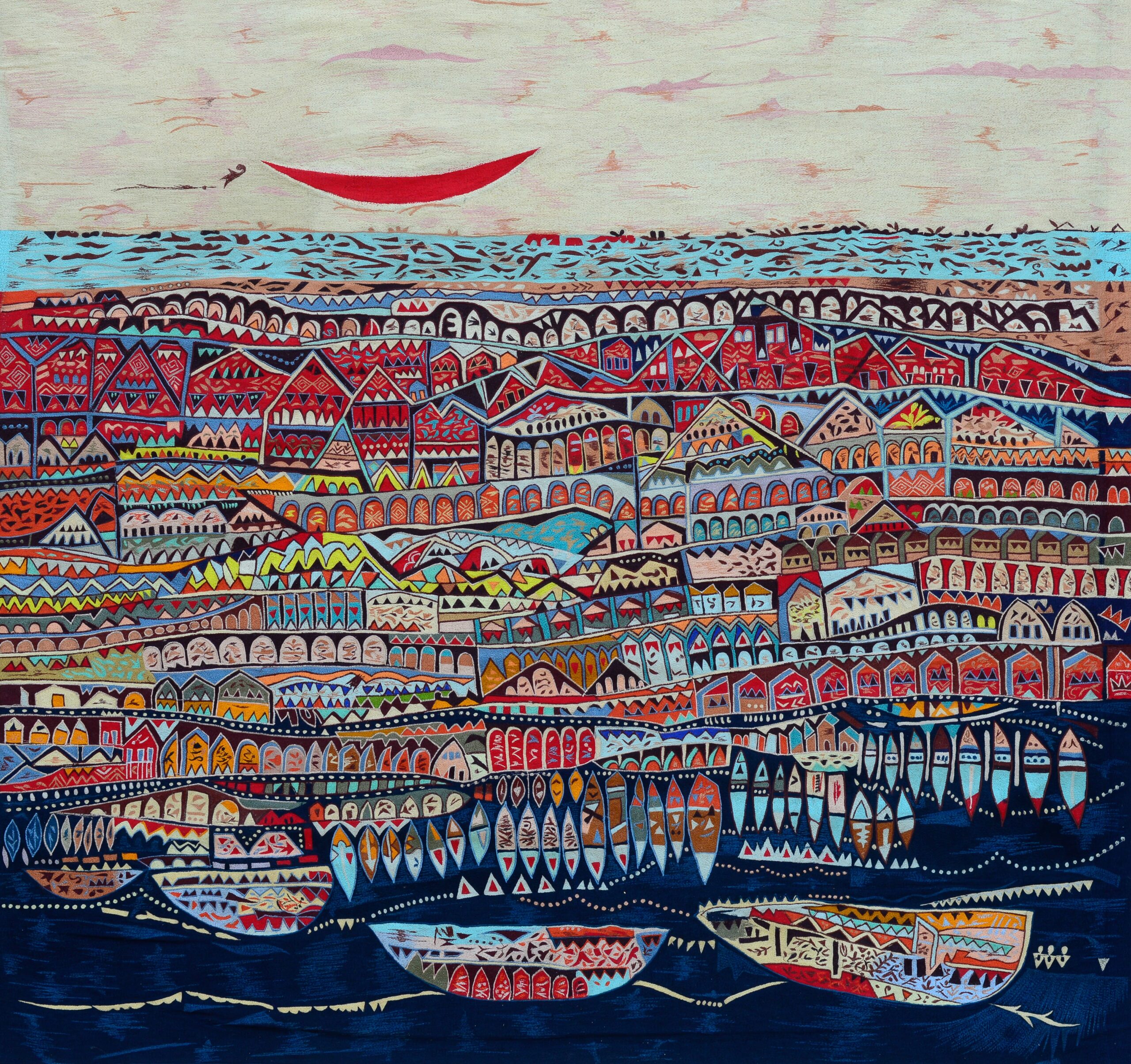 Her nomadic lifestyle is evident in her paintings as she celebrates this diversity from a deep respect and appreciation of divergent cultures which meld together in our interconnected world. The Moghul miniatures, Arabic calligraphy, intricate embroideries from Bangladesh, use of gold-leaf from Egypt, combined with an art background from Sweden and the Philippines are few of the factors which depict her deep love to the rich traditions of craftsmanship via her complex, vibrant canvases.