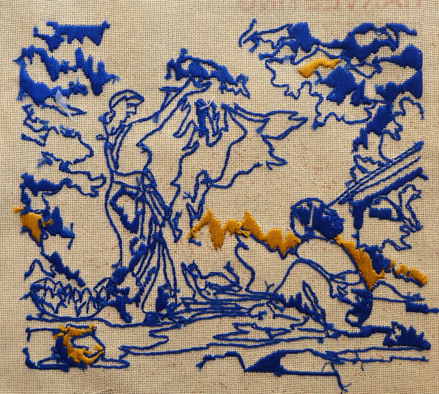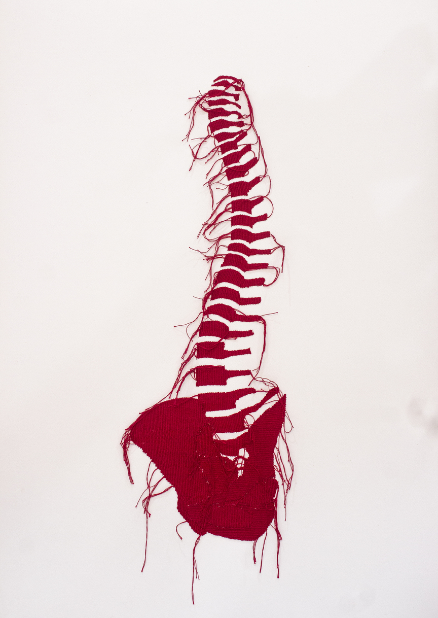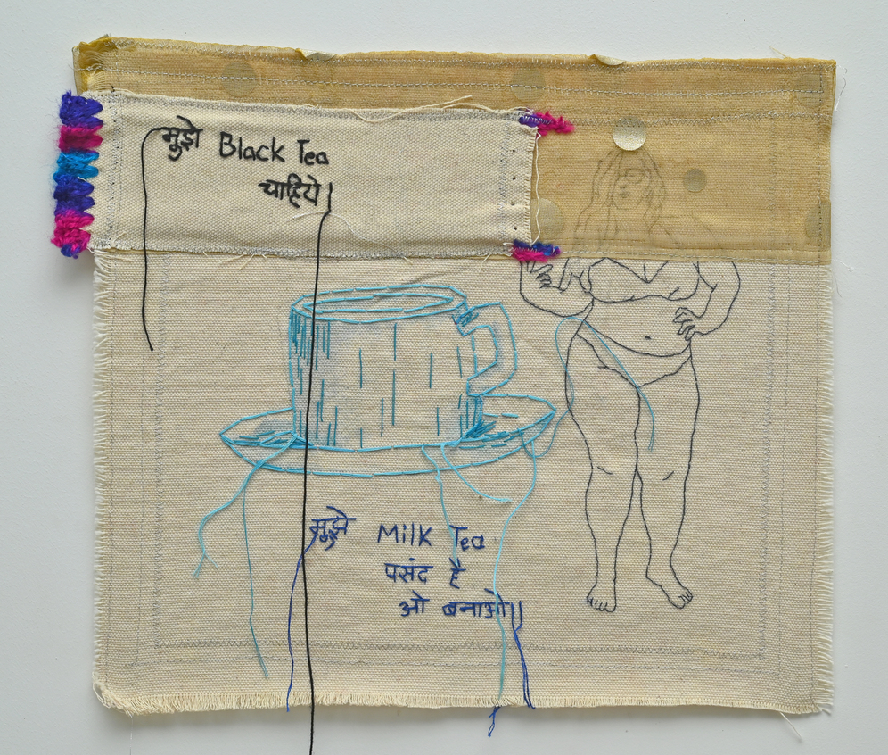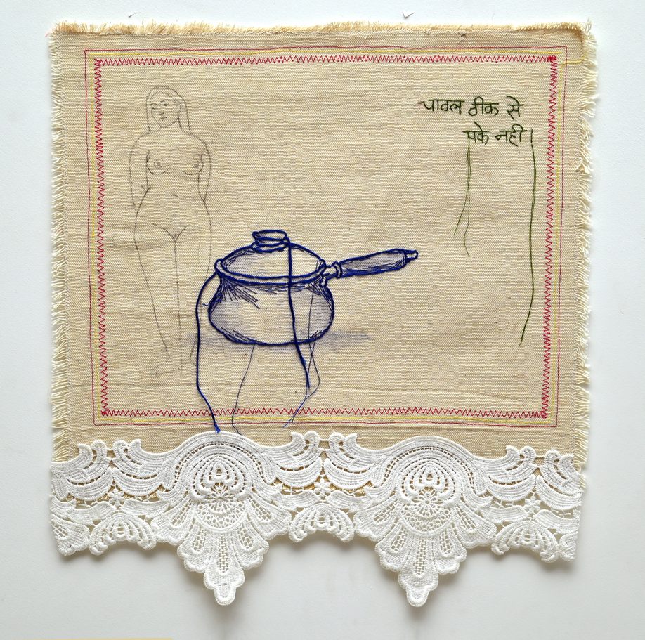 Mayuri Chari (1991) learnt to embroider as a craft that the patriarchal traditions of Goa expected out of her for the role she would take on in the future of being a housewife. She instead decided upon an intercaste marriage and rebelled against the norms of her family and decided upon marrying without the rituals of marriage or a trousseau. Goan girls across castes and religions learn to embroider their trousseau, a tradition brought down by the Portuguese during the period of colonisation that began in the 16th century. Many are unaware of this legacy and continue the practice as women’s work. Mayuri has been additionally making nude self-portraits of herself on cloth that are embroidered. While studying for her masters in Hyderabad she made an ink self-impression of her nude body on paper. She was later shamed by her friends who were mainly women who described the works as being vulgar. She realised a stylised nude of a woman made by a male painter is acceptable to society, one which adheres to a body constitution not shared by the majority of women. Her works then began to address complex contexts of menstruation and agricultural labour and how women are used as cheap labour and expected to work more than men for lower wages.