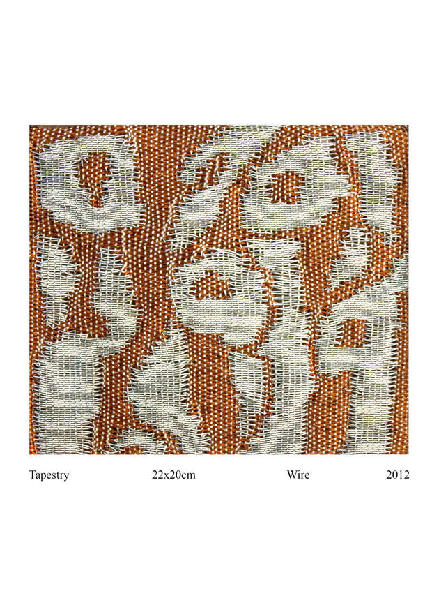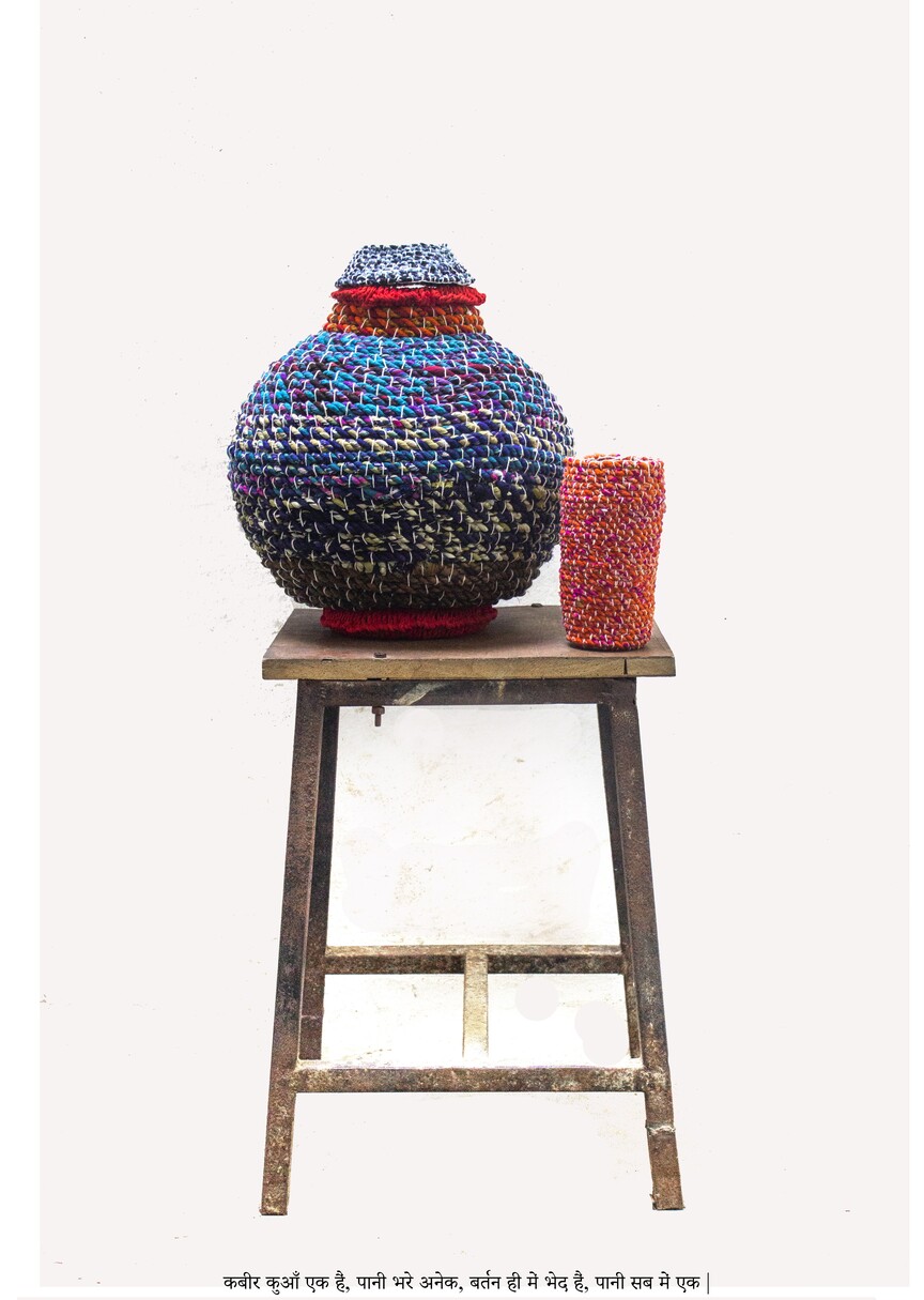 Anshu Singh (1989) comes from a family where the women have been involved inBanaras’s extensive weaving industry since the last few decades . The industry of handloom weaving and embroidery in Banaras goes back into a time where its most important poet-philosopher Kabir grew up in a home where he had been adopted by an old couple who were weavers or Julahas. Julahas or Ansaris are a marginalised caste of Muslims who within the caste system prevalent in Indian Islam are from the lower castes. Their handiwork in embroidery and weaving expensive Banarasi sarees that use both gold and silver thread is very lowly paid and the profits are exploited by middle caste traders who are Hindu. This interdependence is championed as communal harmony but with increased communalisation of politics the Julahas are being culturally, socially and politically marginalised in Eastern Uttar Pradesh. Kabir who embodied a move away from traditional norms of both Hinduism and Islam where he preached a syncretic form of faith based rationalism against the divisions of caste, religion and gender, sawing weaving as a spiritual act and he would often call himself ‘ Kashi Ka Julaha’ or the ‘ Weaver of Banaras’. Anshu is a deeply politically aware artist and she often uses motifs which may appear as abstract but are actually derived from a ‘letter’ or a script that symbolises a layered socio-political context. She often integrates writing into her woven ensembles that come from a legacy of word play often used by Kabir in satirical couplets and poems that spell out a social message. Addressing conceptual ideas through weaving Anshu Singh asserts the role women play in the weaving industry but are also often forgotten as silent labour unseen to the economics of the industry.