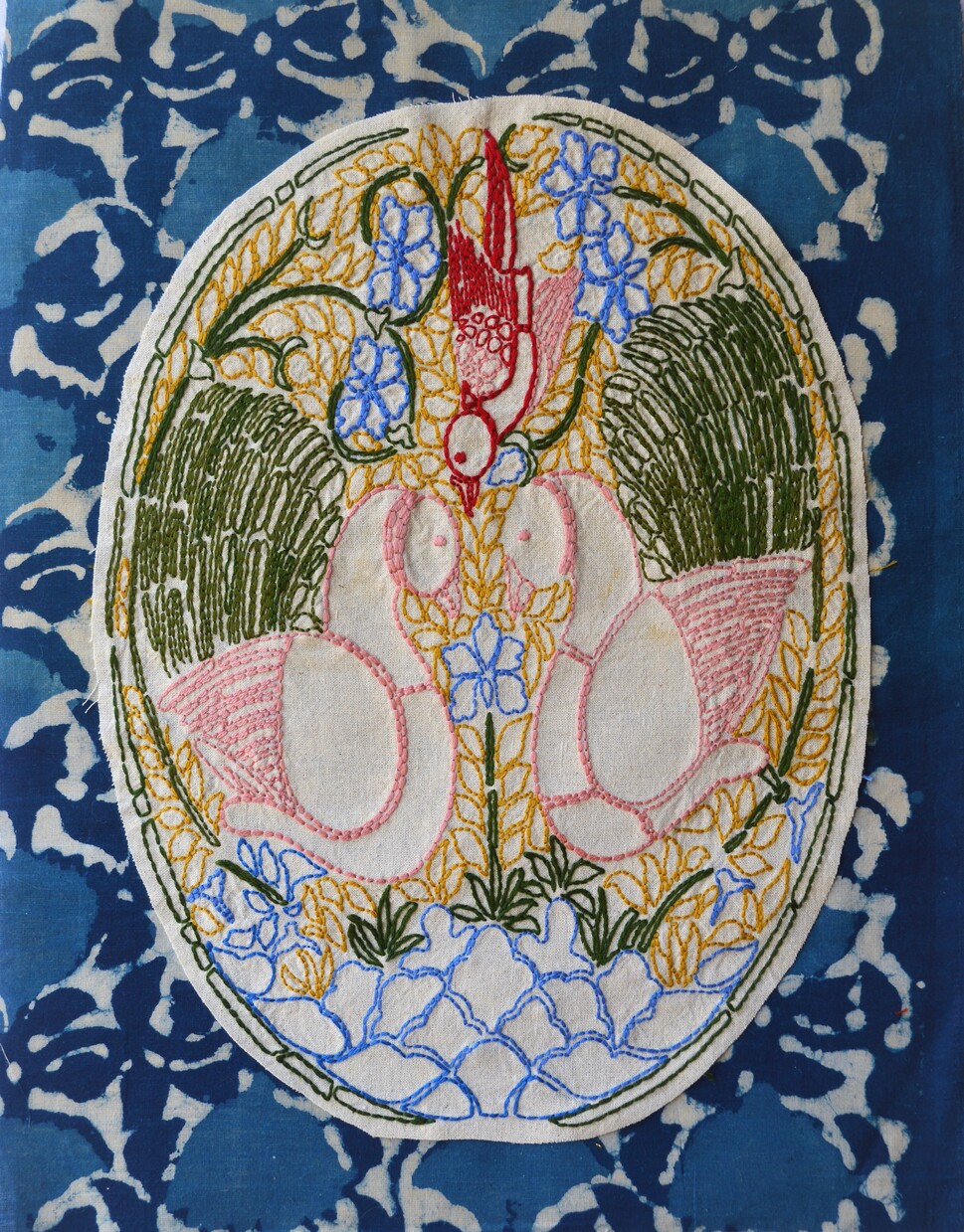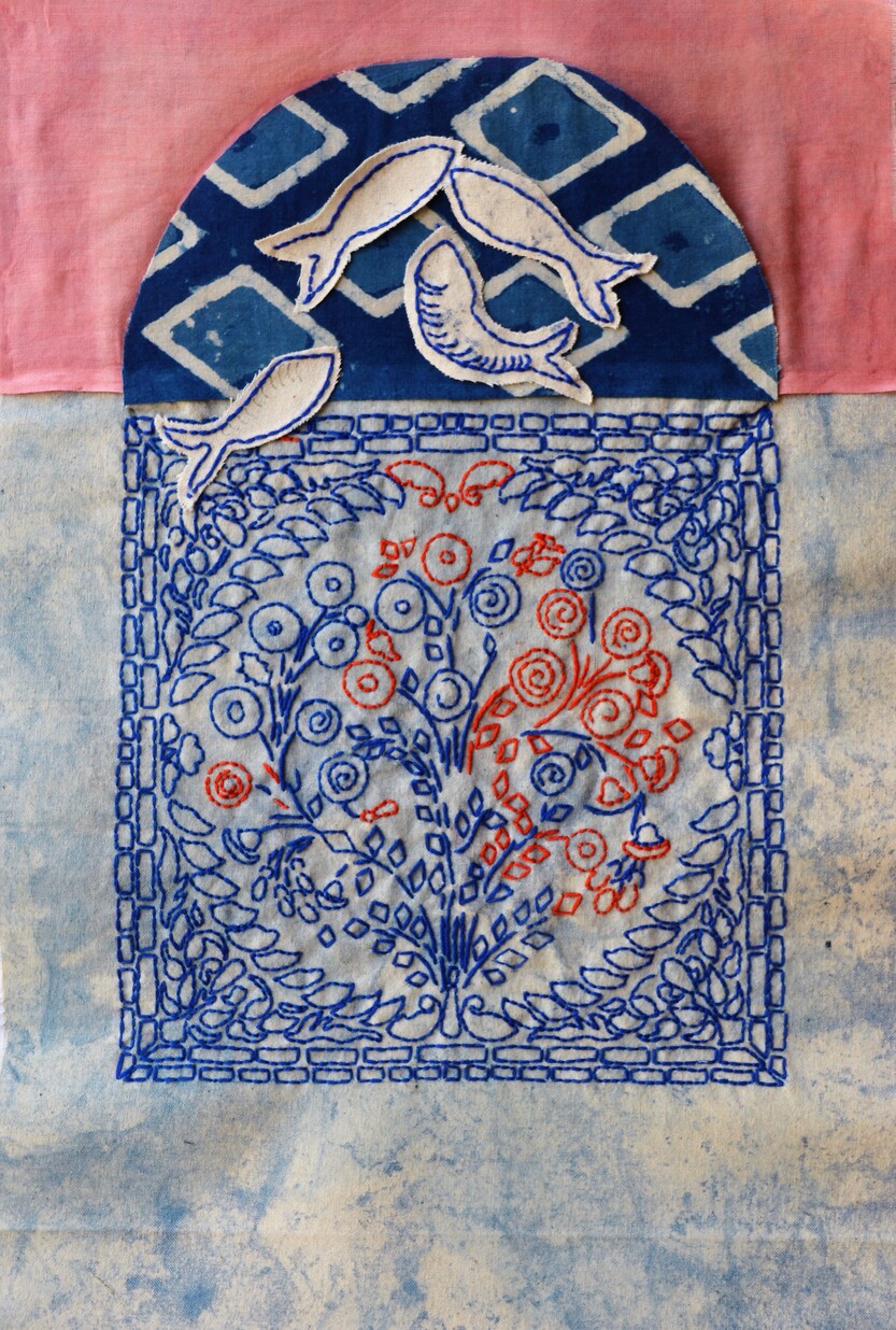 A collection of autobiographical embroidered works by artists Mayuri Chari, Meenakshi Nihalani and AnshuSingh opens at the Gallery Art & Soul with narratives around distinct personal histories of the three artists. Meenakshi Nihalani (1978) is an artist based in Bombay who interlays indigo and the history of post-partition migration of women from Sindh to the camps of Mahim, Ulhasnagar, Chembur and Worli. These women would collectively sit and embroider table mats, bedsheets, tablecloths and stoles for sale to raise money as a form of sustenance. Women’s help groups and entrepreneurial women’s collectives formed the back bone of a cottage industry around these camps where they would also make condiments, pickles and papads. Sindh was known for its handicrafts for many millennia – the entrepot trade from the Harappan sites extended until the Phoenician Mediterranean. But during the relatively prosperous reign of the Talpur Mirs traders from Shikarpur and Sukkur began producing Ajrak textiles and other embroidered products on a large scale. After Charles Napier’s conquest of Sindh these traders sought the patronage of the British and followed them onto their ship routes to England settling in British dependencies and ports on the Suez as well as those around the Cape of Good Hope. Sindhi merchants who lived for long periods of exile on the trade routes began to be called ‘Sindhworkis’ – or those who dealt with ‘ Sindhwork’ – embroidered textiles and enamelled metal. Nihalani’s art practice includes drawing and embroidery where not just the long history of Sindhi handicraft gets vocabularizedvisually but also arrives from a deep sense of feminist understanding of collective work that monumentalises the collective memory of a trauma such as partition.
