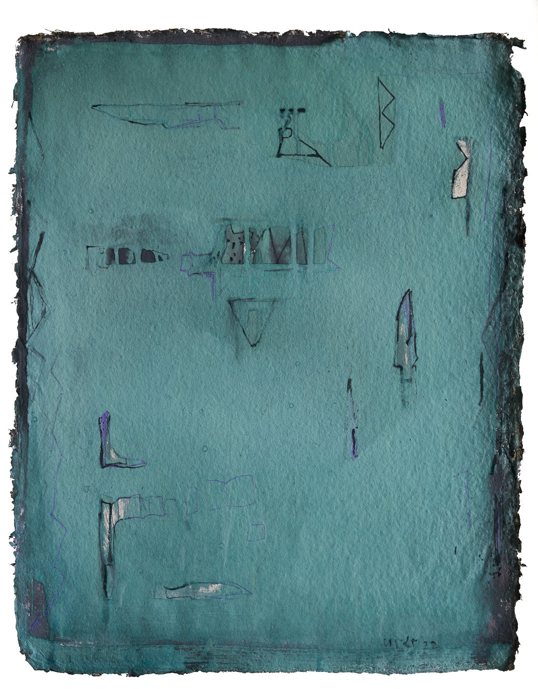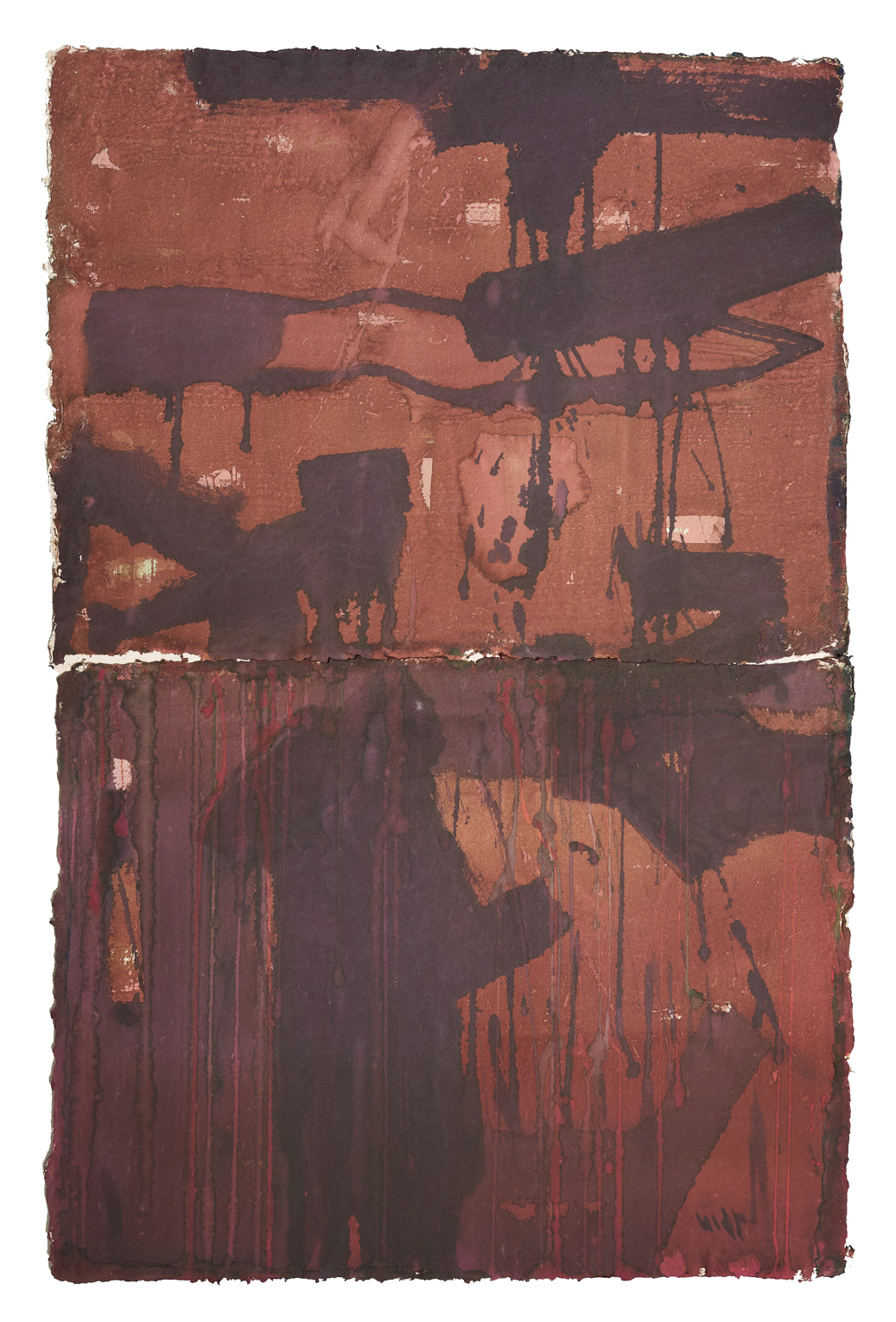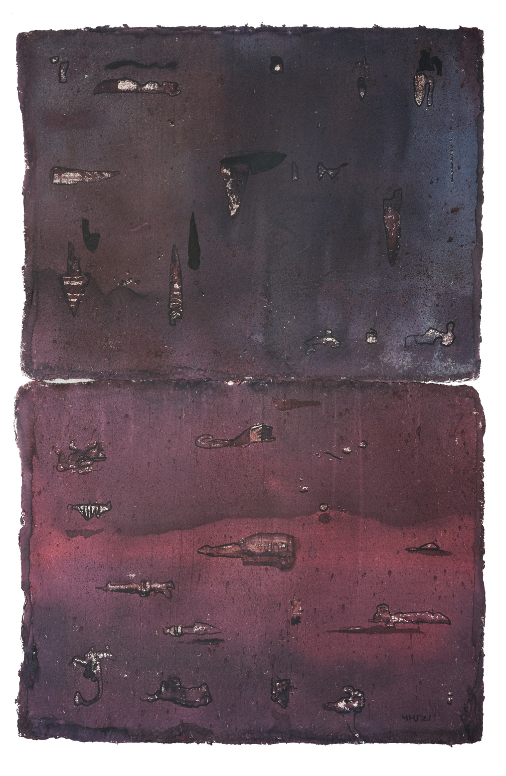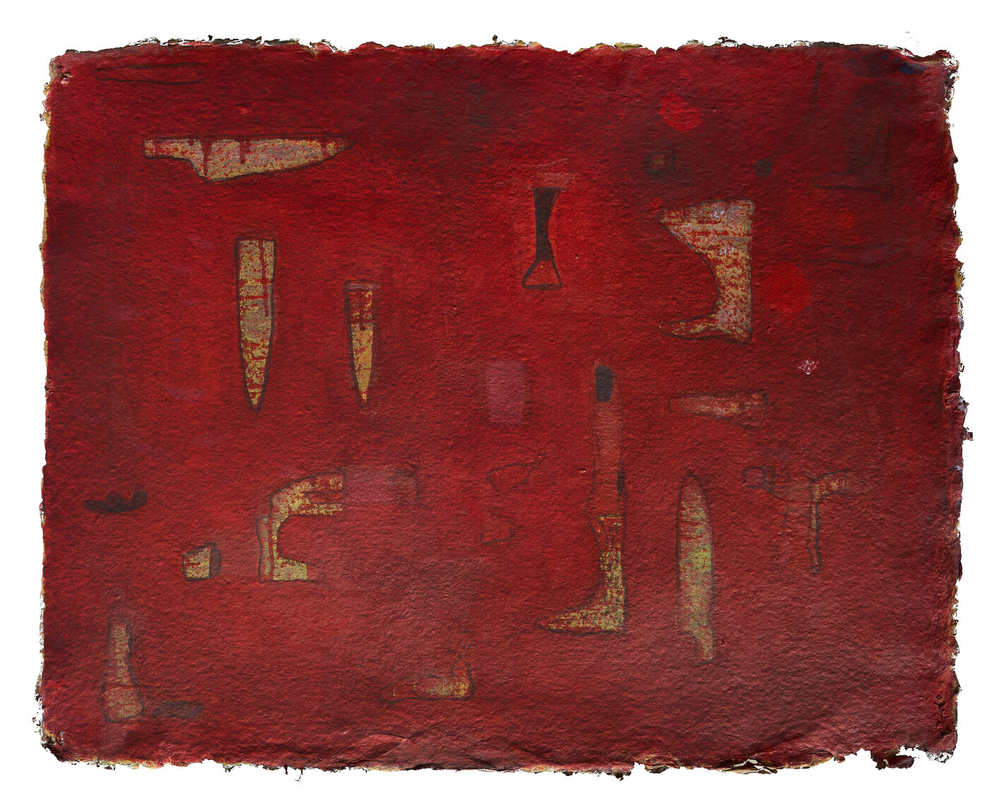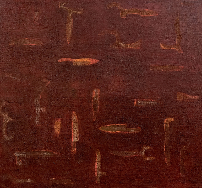 The conversation with the tools of his past continues in the monotoned canvases of Para which hold deep hues and textures of layers that build an orchestrated pictorial surface arranged in purposeful rhythm that retells the regionalism of mud homes flattened and smoothened by the hands of the women in his village.
